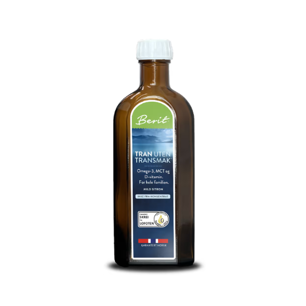 Berit cod liver oil without fishy aftertaste with omega-3, MCT and vitamin D is a blend of marine and vegetable fatty acids. It consists of cod liver oil from Norwegian Arctic cod (Gadus morhua) and pure MCT (medium-chain triglycerides) from coconut oil.