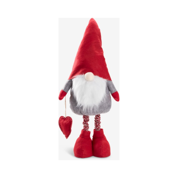 A charming Christmas gnome in traditional red and grey colors. This free-standing decorative figure features adjustable legs, allowing you to easily change the height to suit your holiday display.