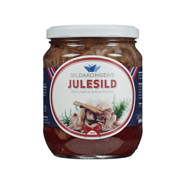 Sennepsild (Mustard Herring): Spiced herring 58% (110g), mustard (water, yellow and brown mustard seeds, sugar, vinegar, modified potato starch, spices, citric acid E330), water, sugar, vinegar, rapeseed oil, Sildakongen’s spice blend, dill, beta-carotene, preservatives (E202, E211), thickeners (E466, E415, E412).