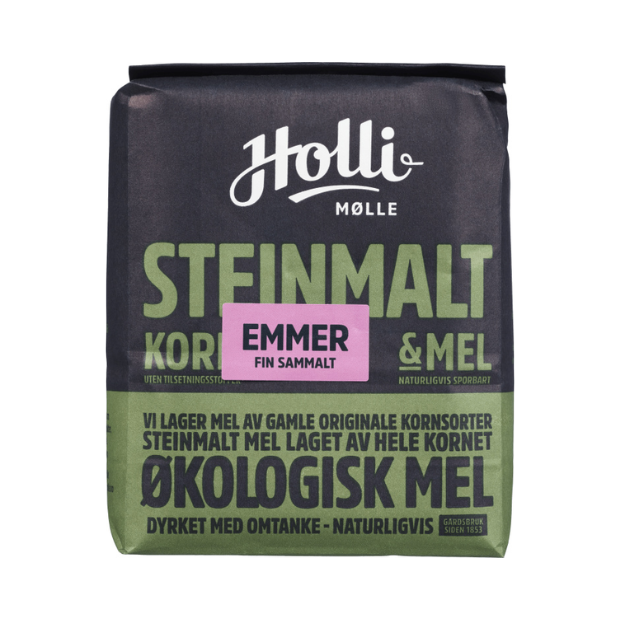 Holli Mølle Wholemeal Fine Emmer Flour is a gently stone-ground organic flour made from ancient emmer varieties grown in Norway by local farmers who are fairly compensated for their crops. Each bag is labeled with information about where and by whom the grain was grown.